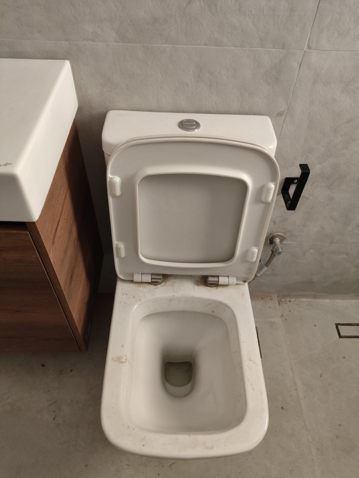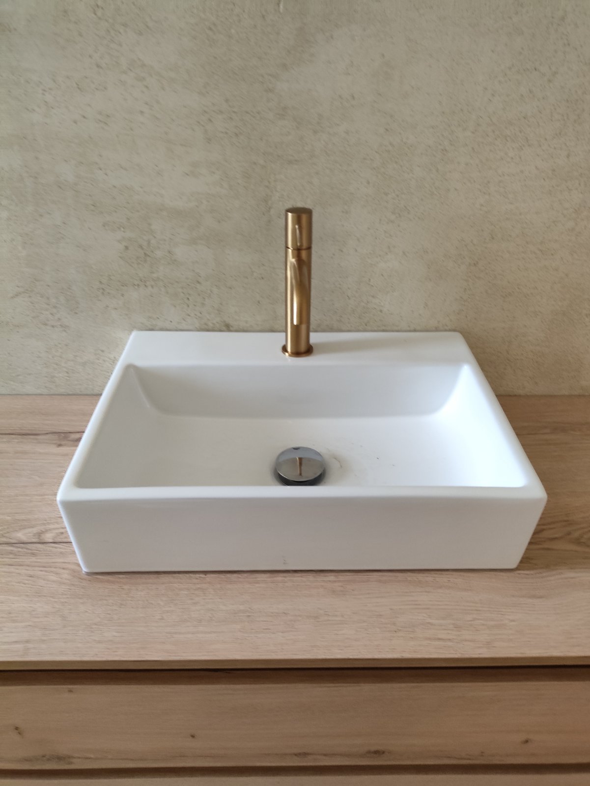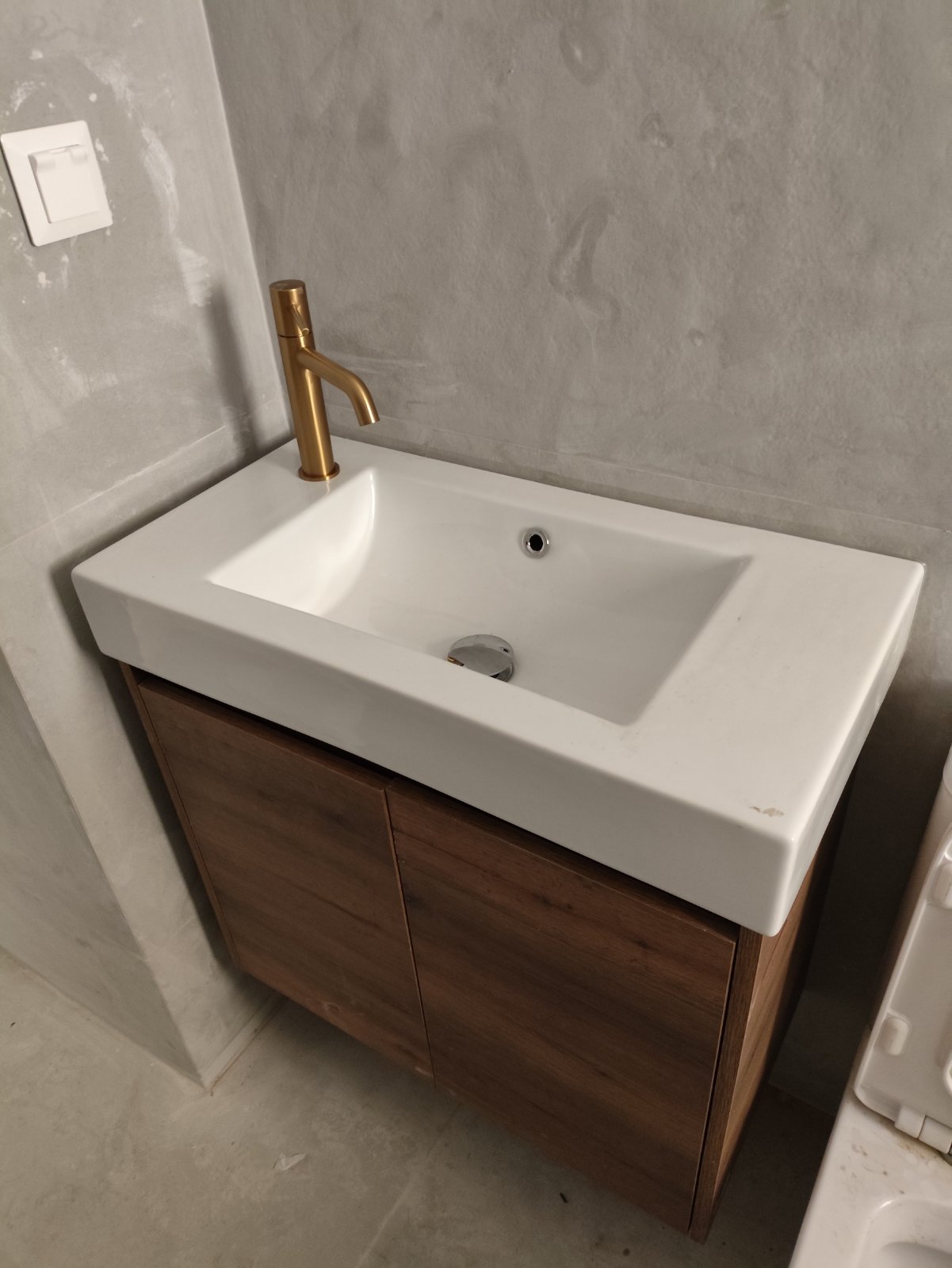 Είδη Υγιεινής & Έπιπλα: Εγκαταστάθηκε κρεμαστό έπιπλο μπάνιου σε φυσική απόχρωση ξύλου, το οποίο δημιουργεί μια υπέροχη αντίθεση με το γκρίζο της τσιμεντοκονίας. Ο επιτραπέζιος νιπτήρας και η λεκάνη back-to-wall προσδίδουν κύρος και εξοικονόμηση χώρου.